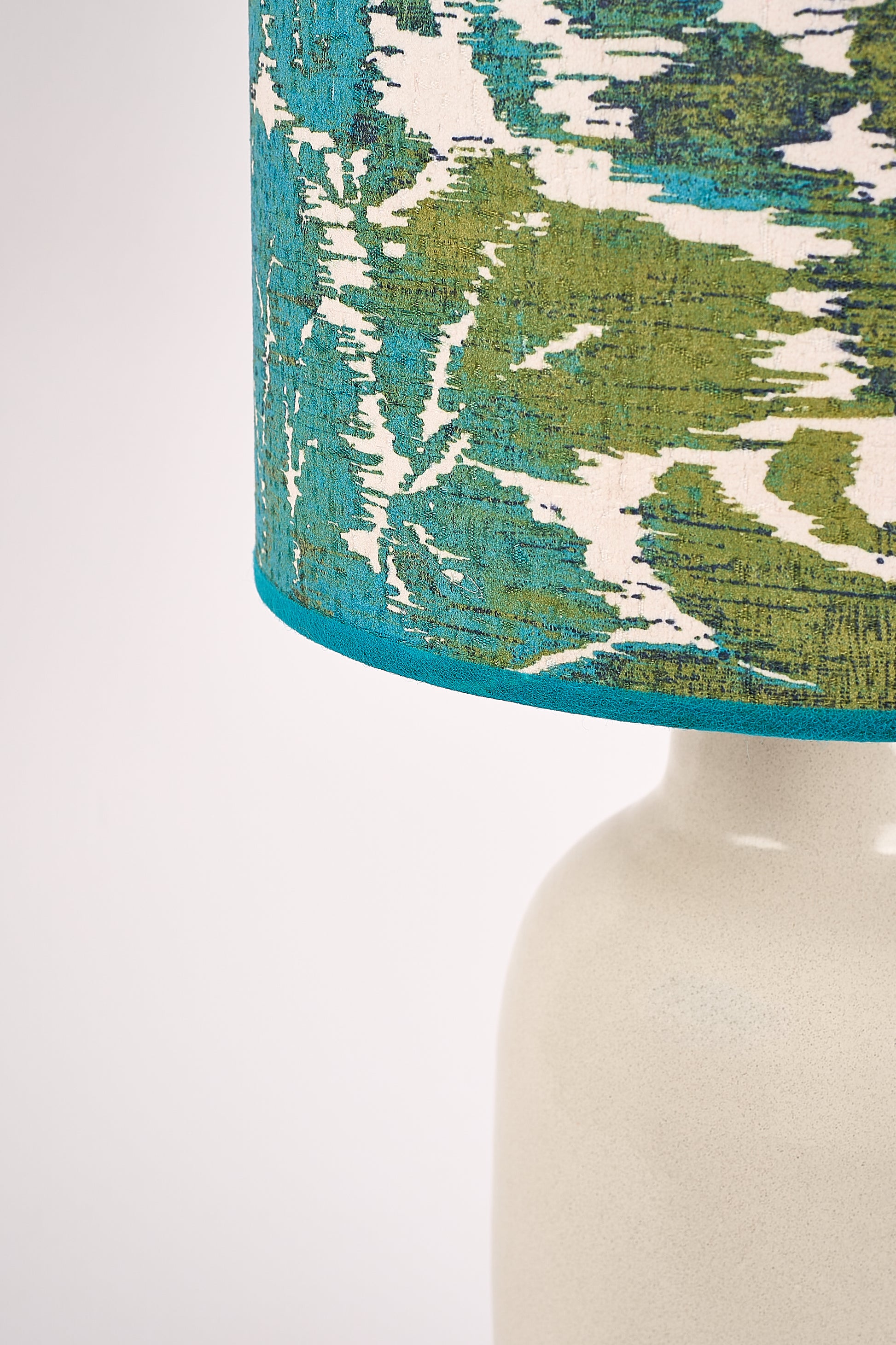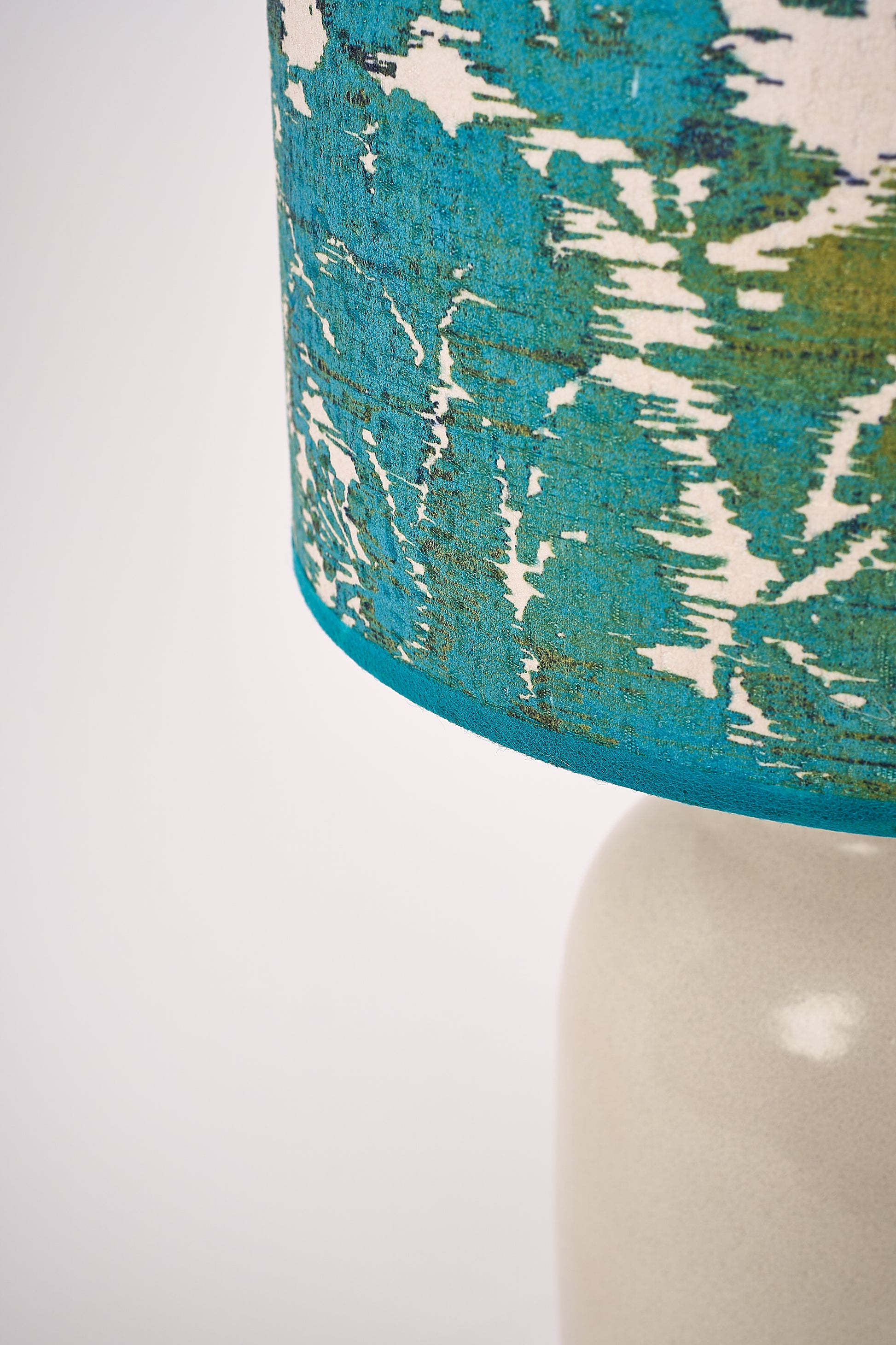 A fully handmade table lamp with a smooth, glossy grey sculptural base, paired with a patterned lampshade finished with turquoise trim. Designed to feel collected, not styled. Each piece is unique.