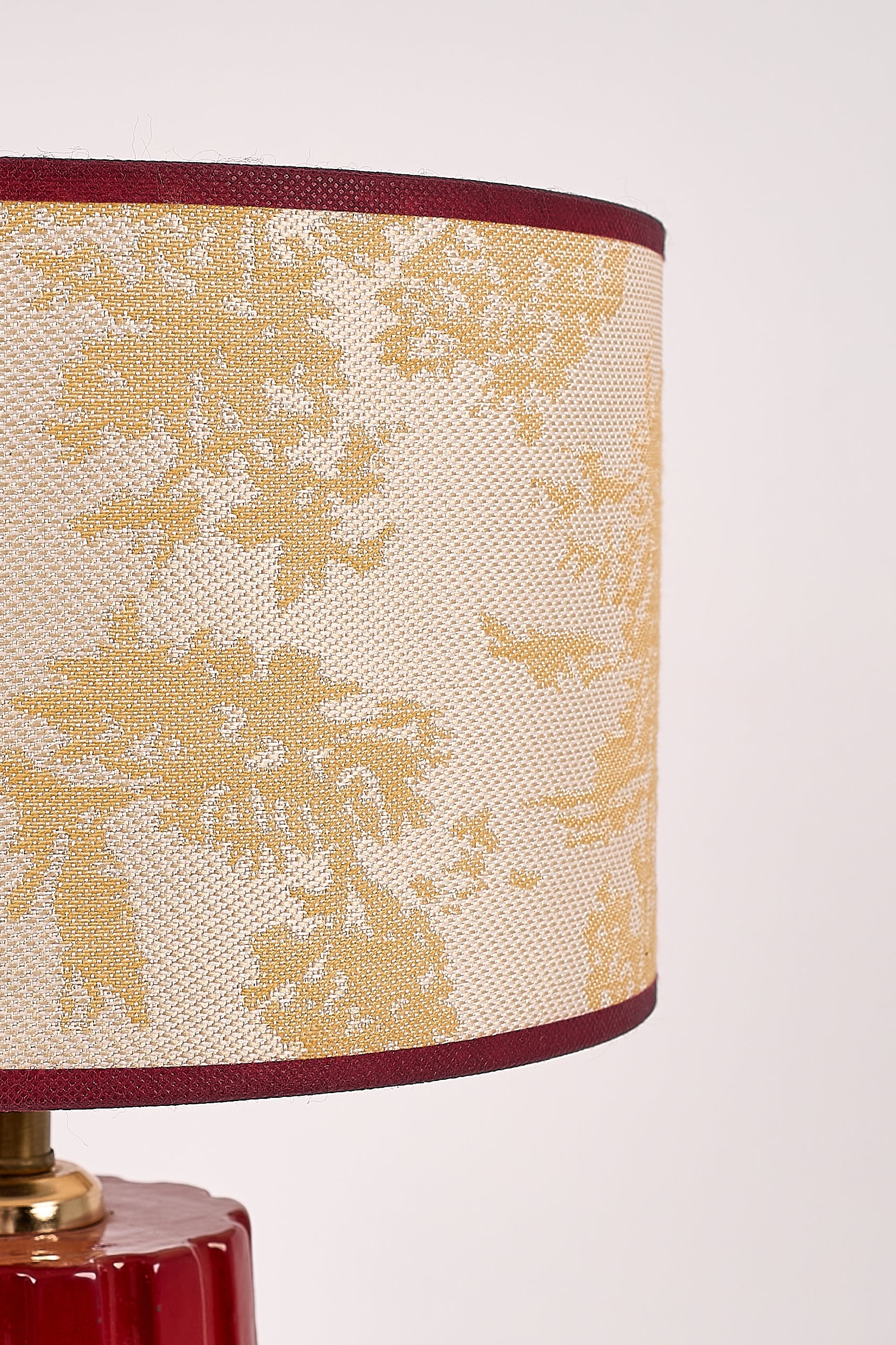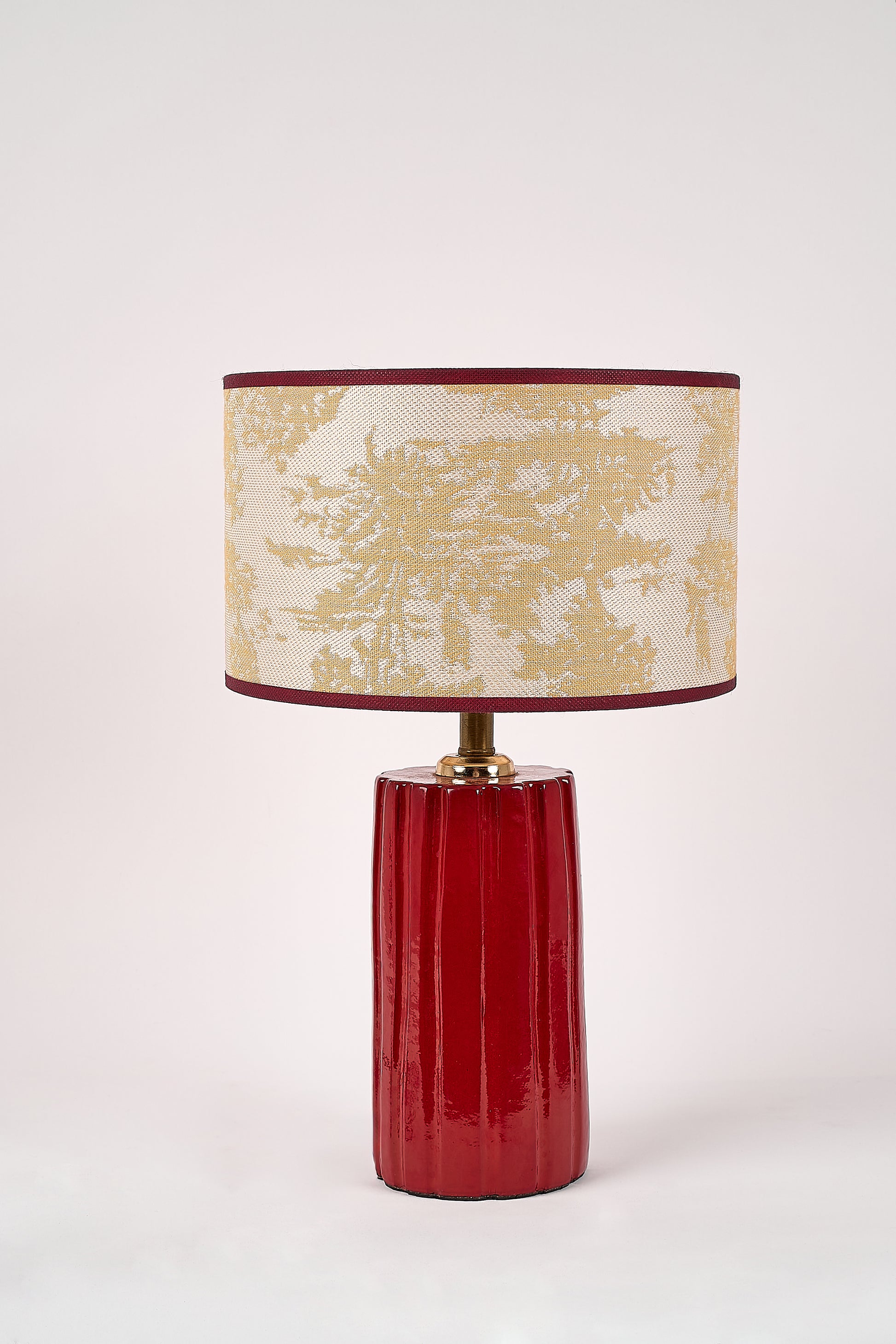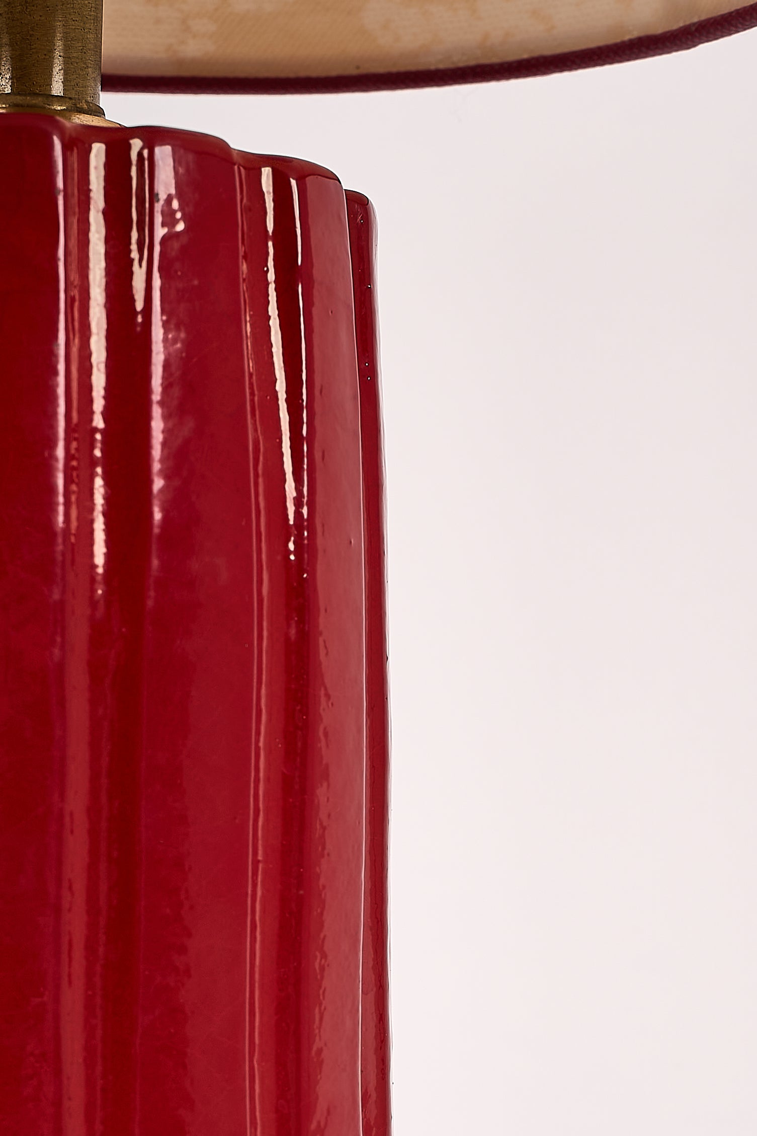 A fully handmade table lamp with a sculptural high-gloss red base, paired with a Chinese-inspired lampshade finished with red trim. Each piece is unique.