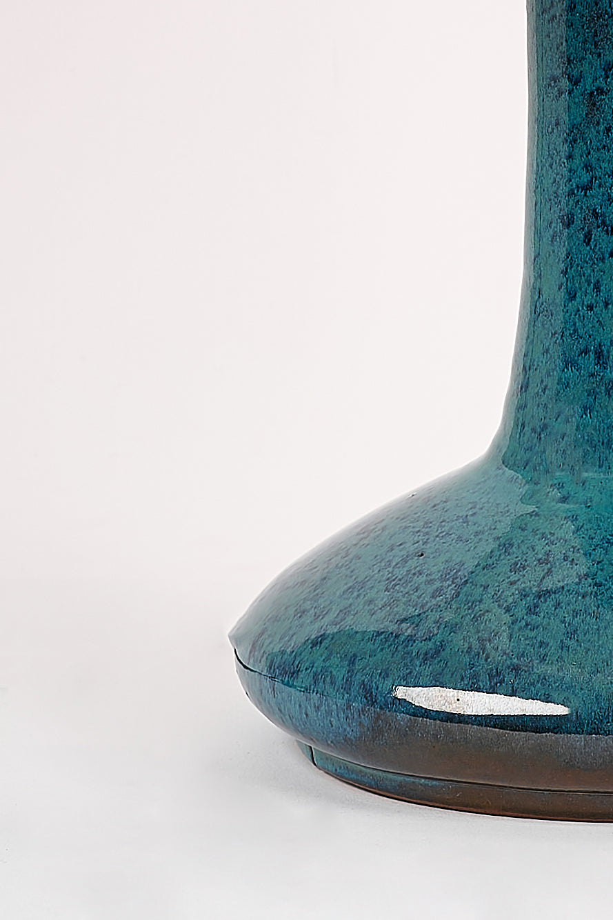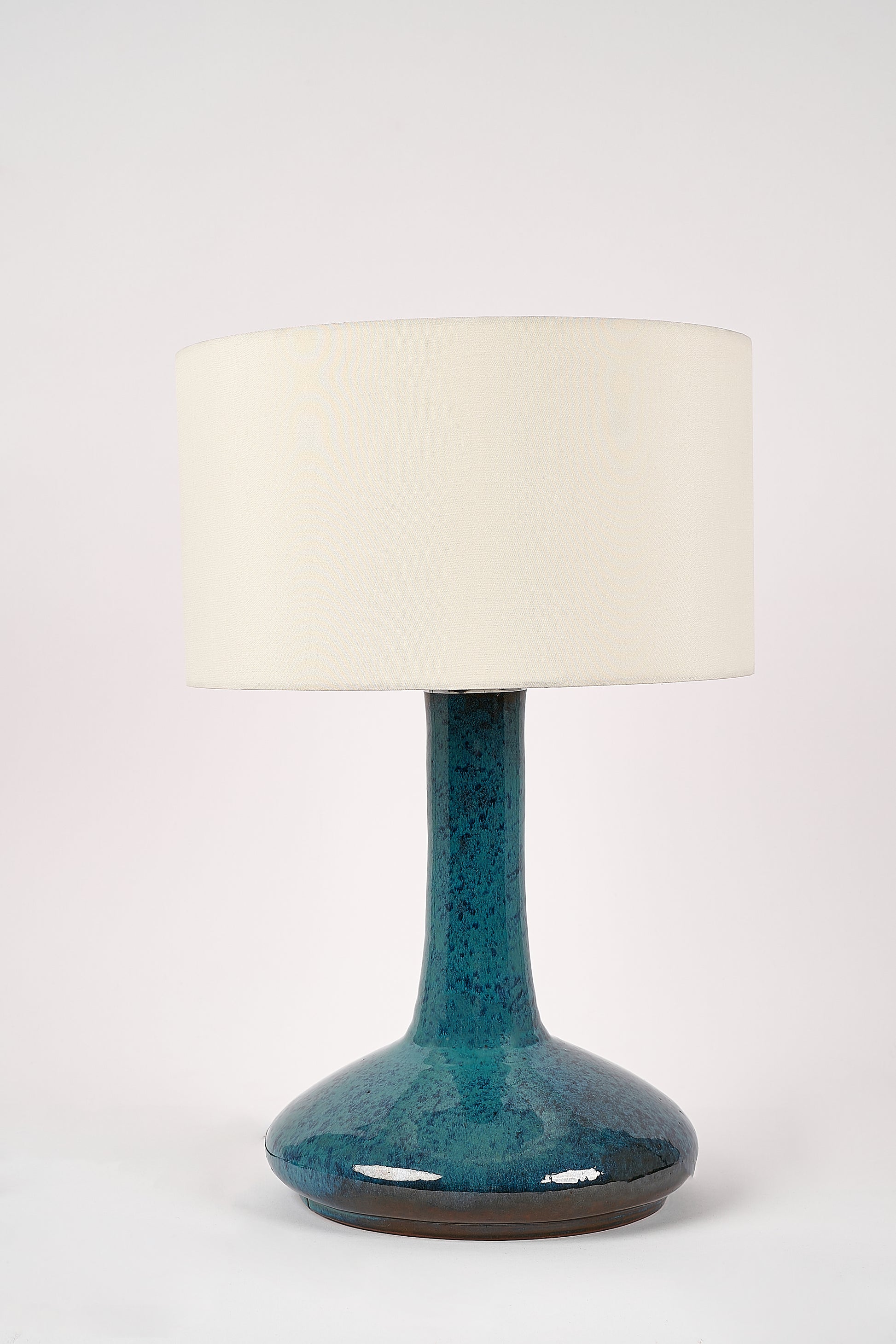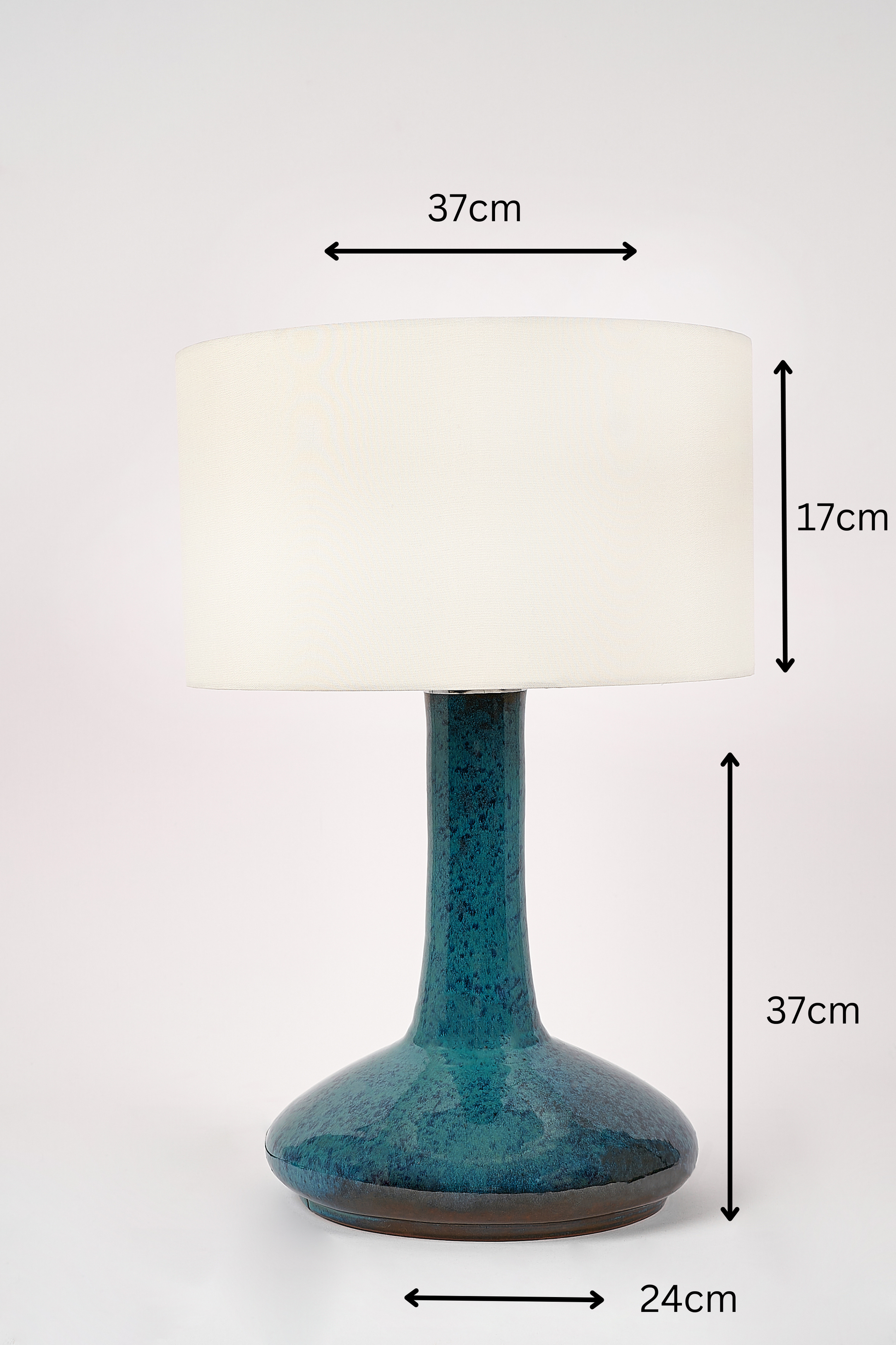 A fully handmade table lamp with a glazed blue base and dark blue splashed accents, paired with a simple white lampshade. Each piece is unique.