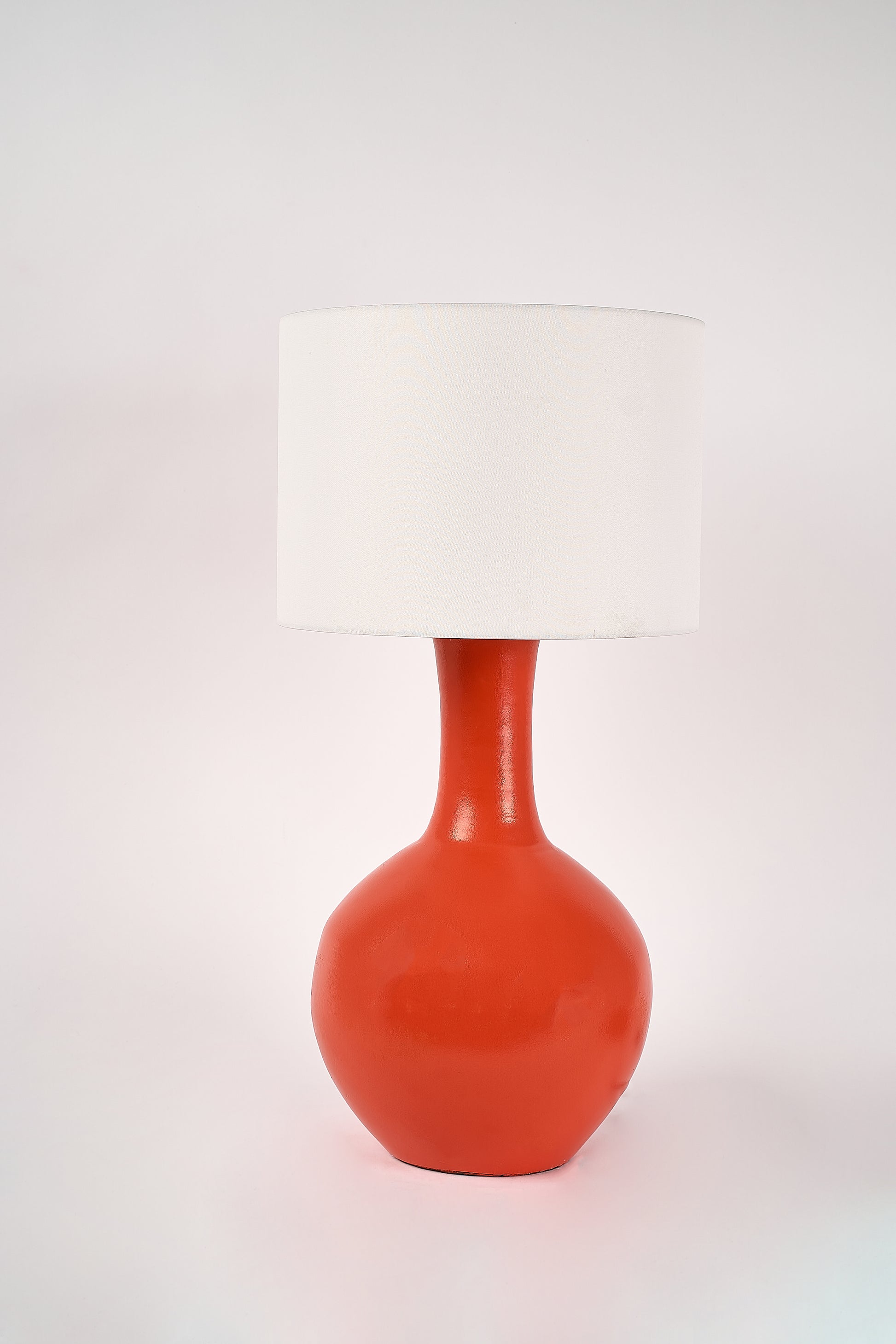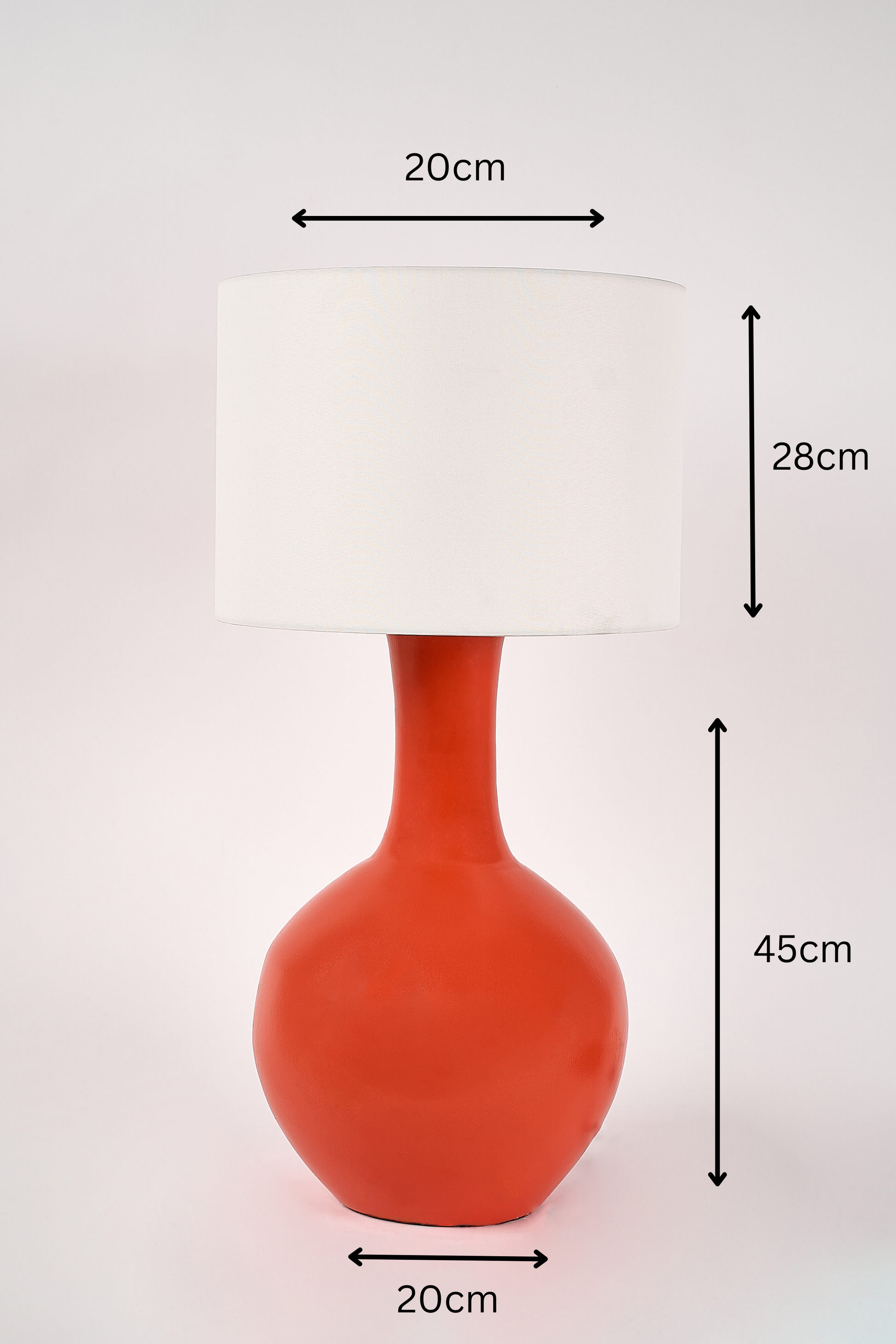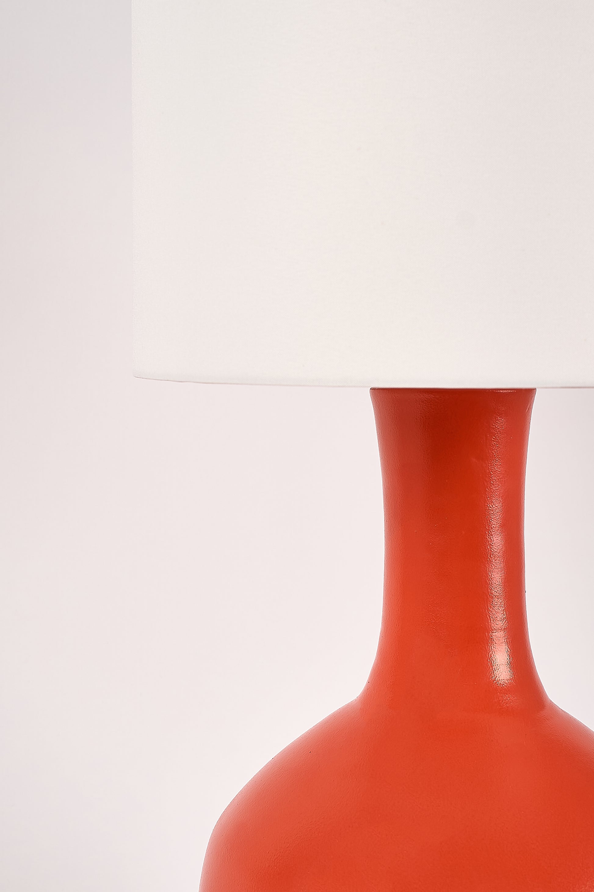 A fully handmade table lamp with a sculptural high-gloss orange base, paired with a crisp white lampshade. Each piece is unique.